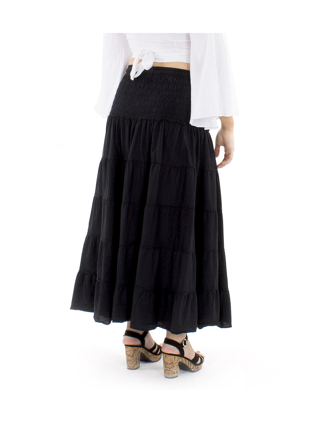 Jupe longue à volants unie 100% coton : La jupe bohème par excellence, originale avec sa variété de couleurs disponibles, menthe, moutarde, fuchsia, pétrole ou simplement en noir pour aller avec tout, elle est surtout très confortable grâce à sa bande de smock autour de la taille, une jupe qui s'adapte à votre morphologie et non l'inverse ! À avoir dans toutes les couleurs si vous êtes une dopamine girl !