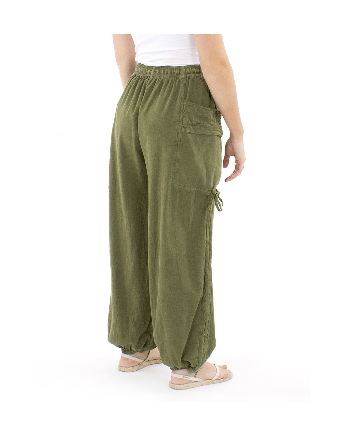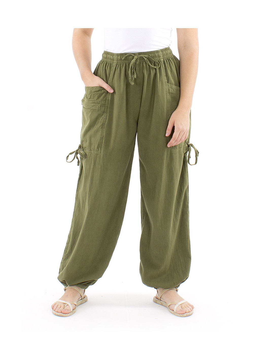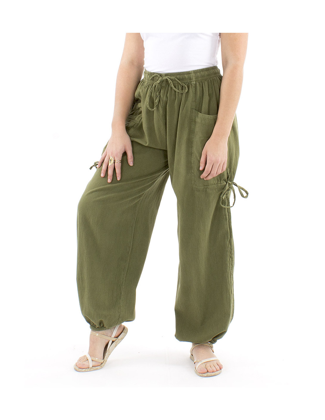 Pantalon coton uni : on aime le style sarouel de ce pantalon 100% coton avec ses élastiques au niveau des chevilles, ses poches plaquées avec liens à nouer sur le côté pour ajouter une touche d'originalité à votre tenue selon votre envie. Conçu avec une taille élastique pour garantir un maximum de confort vous vous sentirez partout comme à la maison. Disponible en 4 coloris différents, du S au XL, un basique à ne pas manquer pour avoir du style tout en restant confortable.