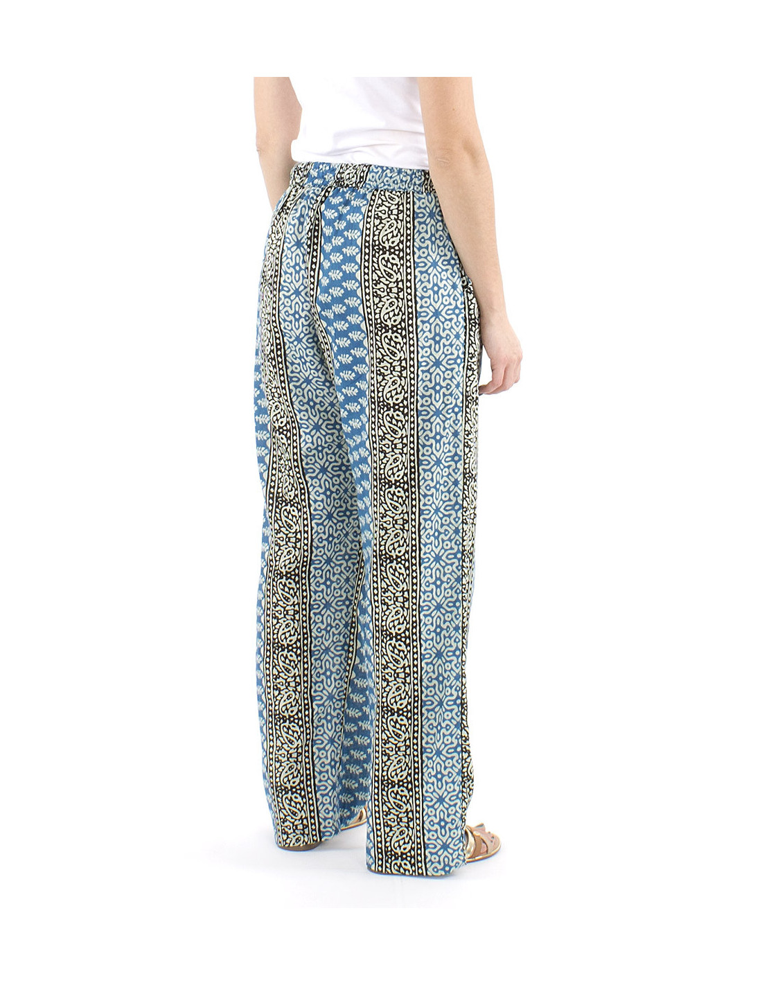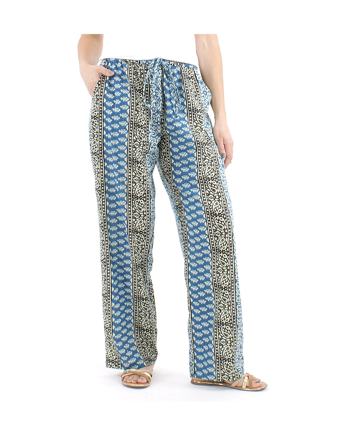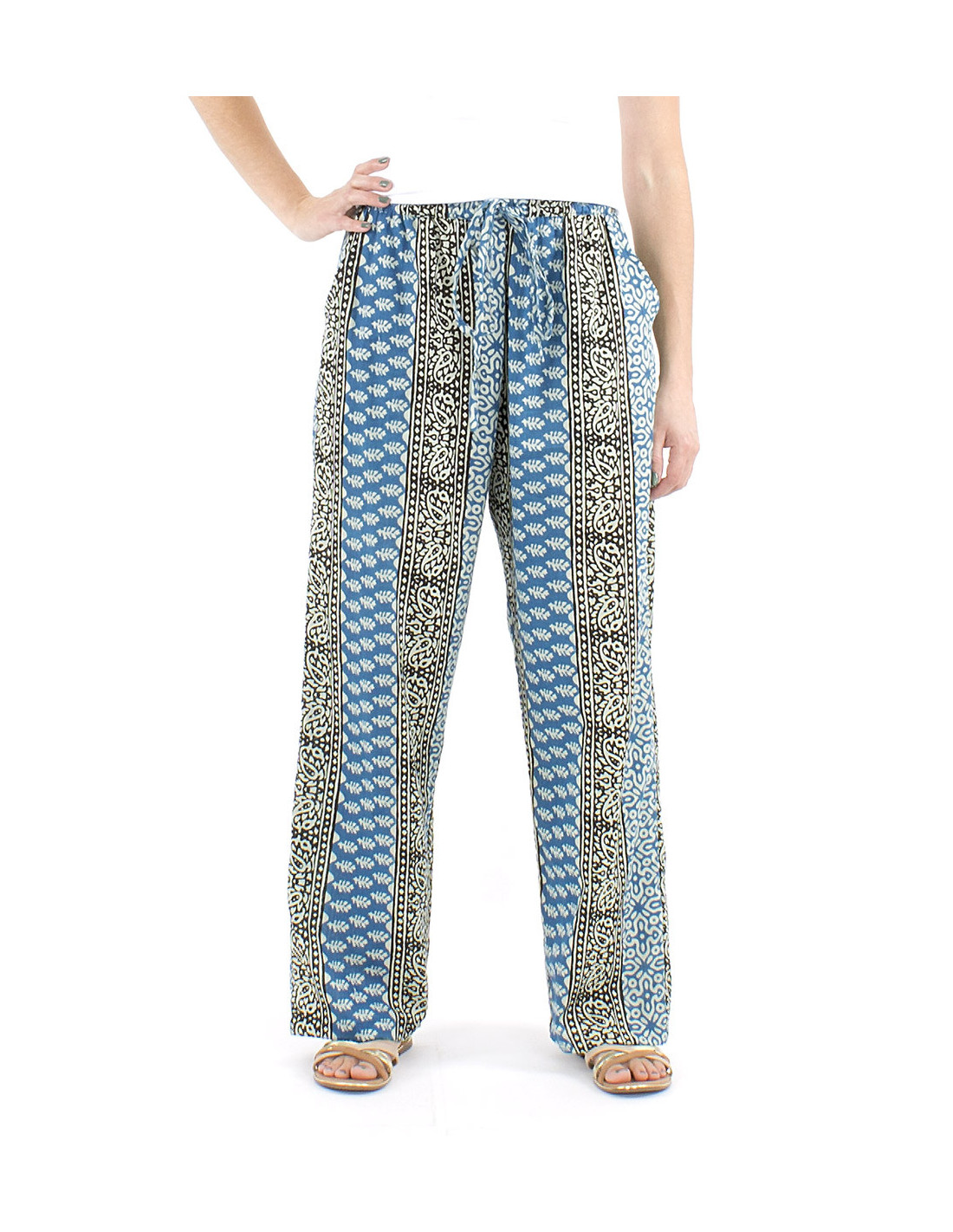 Pantalon droit en coton à motif ethnique : si vous cherchez un pantalon d'été original et confortable vous êtes au bon endroit, cette pièce 100% coton au motif de style ethnique vous conviendra parfaitement avec sa coupe droite mais ample et confortable, ses poches sur le côté et sa taille élastique. Le modèle parfait pour toutes celles qui ne veulent plus sacrifier leur confort au style (ou l'inverse). Disponible en trois coloris différents, il dispose également de liens à nouer à la taille. Tailles allant du S au XL.