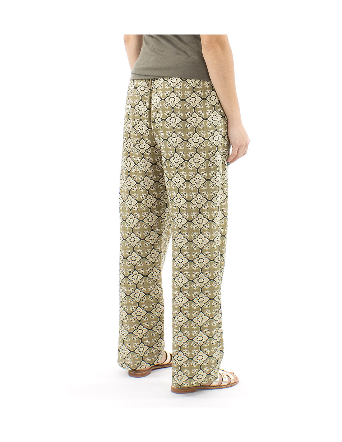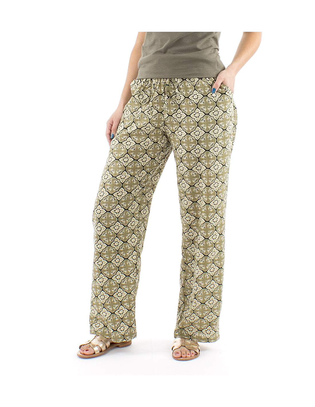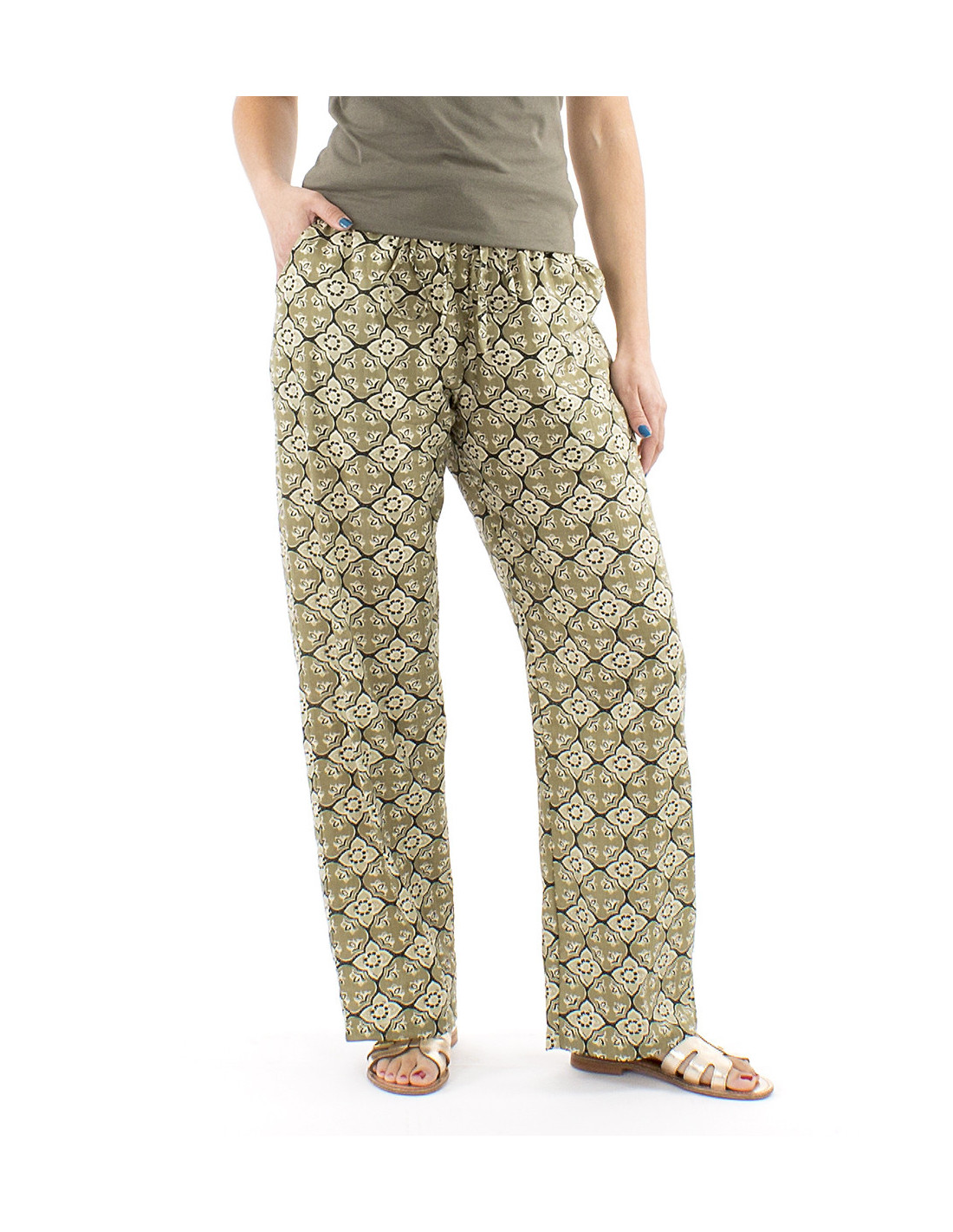 Pantalon droit 100% coton motif oriental : ce motif inspiré du monde oriental avec ses courbes et son mélange de couleurs en camaïeu de kaki ou de bleu (au choix) est aussi original que confortable, conçu en 100% coton, il est agréable à porter et laisse respirer la peau ce qui est un indispensable pour les longues journées d'été. Une coupe simple mais réfléchie avec sa taille élastique qui saura s'adapter à votre morphologie, ses liens à nouer à la taille et ses deux poches sur les côtés, pratique et stylé, le must have de toute garde-robe d'été.