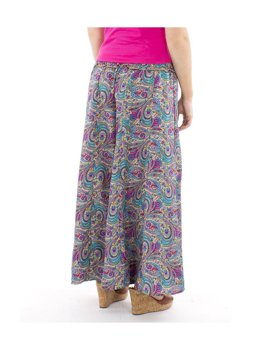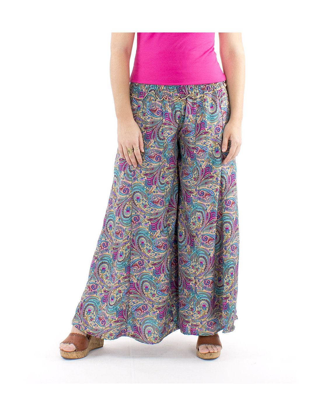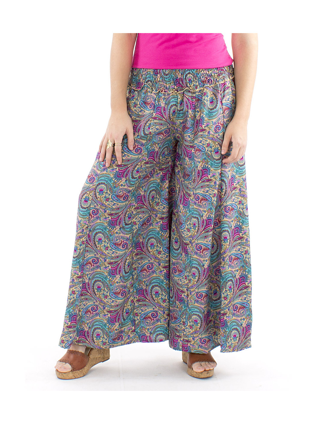 Pantalon oversize motif sari indien : la coupe extra large de ce pantalon est votre plus bel atout confort. Sa ceinture en smock à la taille vous permettra de vous sentir à l'aise en toutes circonstance et quelle que soit votre morphologie, un pantalon curvy friendly qui s'adapte à toutes les femmes quelle que soit leur silhouette. Coloré et original avec son motif cachemire décliné en différentes couleurs, il bénéficie également d'un tomber fluide et léger sans pour autant être transparent. Disponible du S au XL.