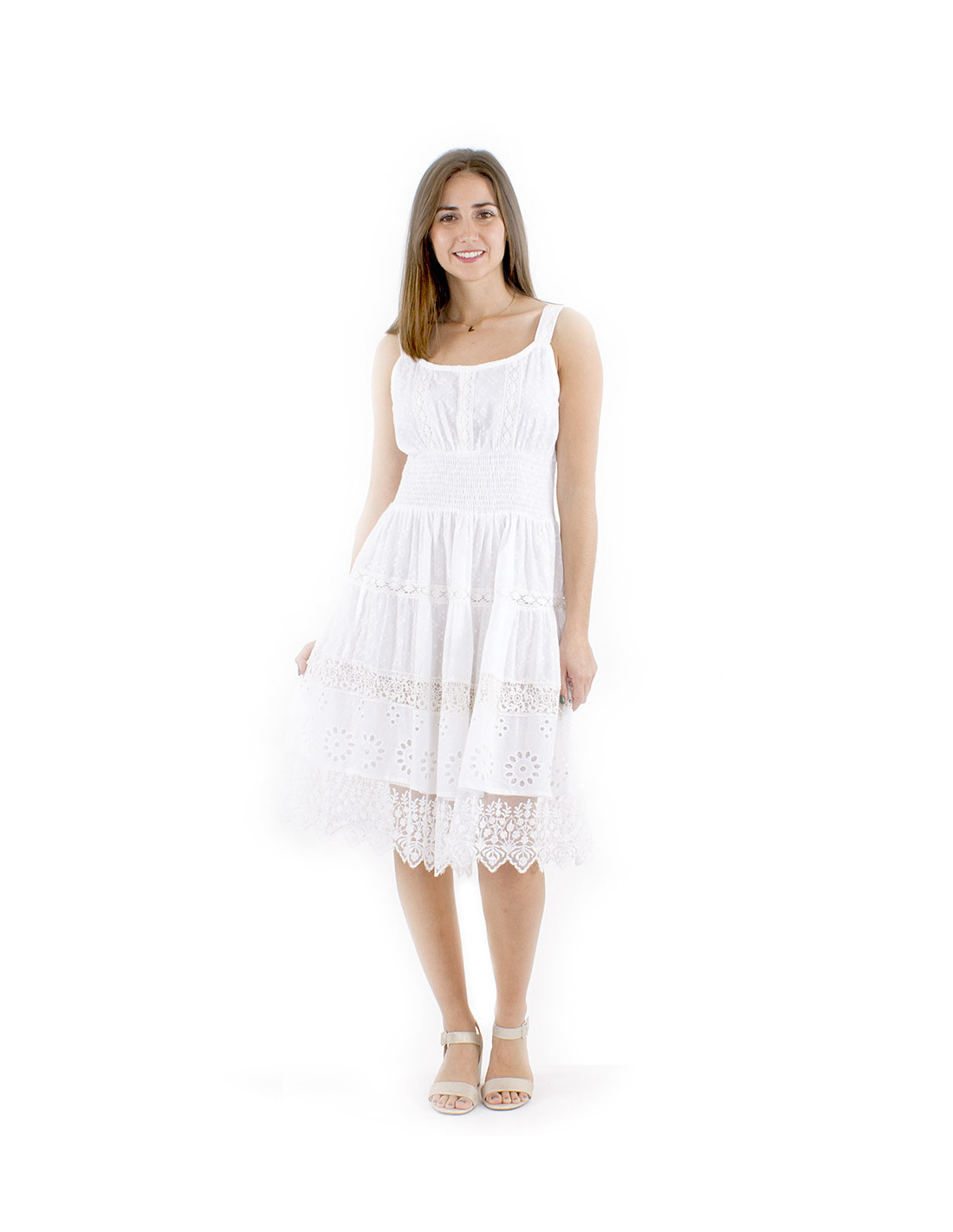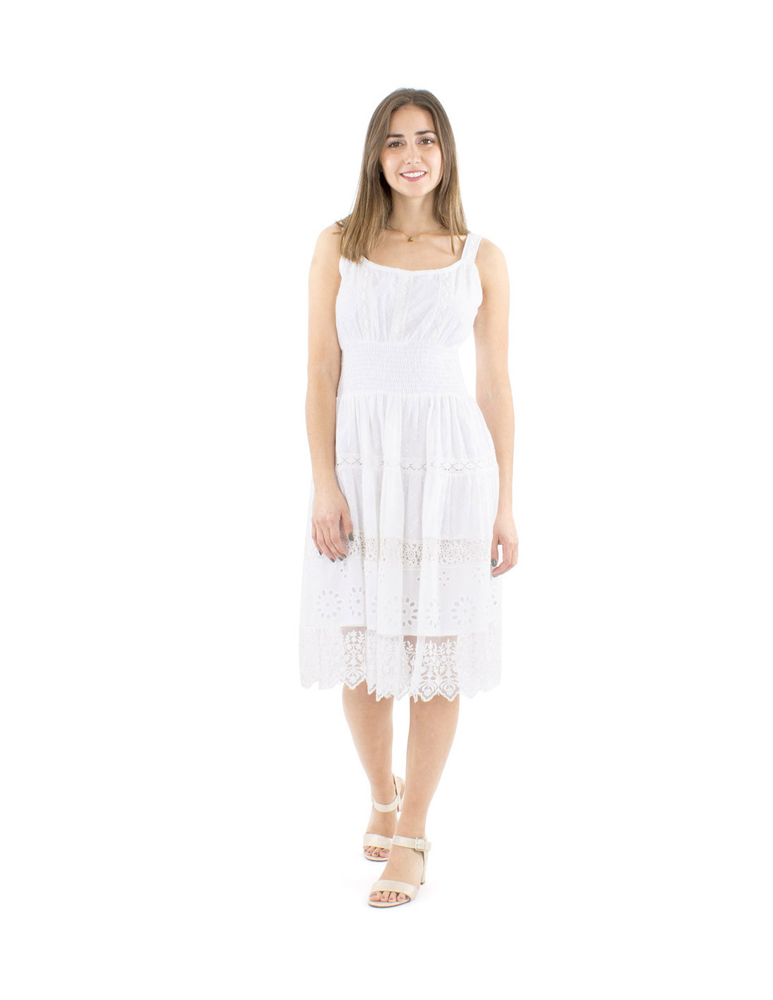 Robe romantique avec broderies et dentelle : cette robe bohème en coton ne peut que vous charmer avec ses détails de broderies anglaises et ses empiècements en dentelle qui jouent sur la transparence et lui donnent un charme romanesque, une robe d'histoire d'amour, ou la belle envoûte son promis par les simples mouvements de sa robe. Doublée en coton également, elle ne laissera pas tout transparaître, son buste est d'ailleurs discret avec un col droit légèrement arrondi au niveau des bretelles qui se veulent larges pour un meilleur maintien. Son smock à la taille ne manquera pas de vous satisfaire, il vous garantit le confort grâce à son élasticité tout en définissant votre silhouette. Plus qu'une robe, une petite merveille, pour les âmes fleurs bleues nostalgiques des temps anciens.