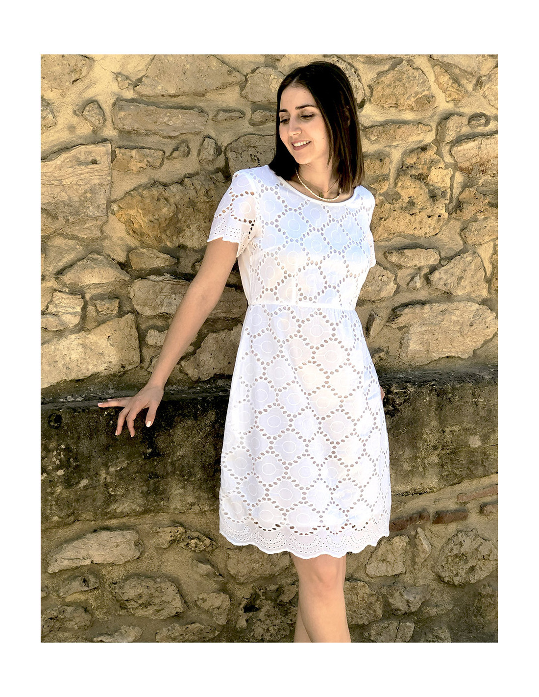 Robe bohème en coton avec broderies anglaises : Une robe sage empruntée au style old-money avec ses broderies anglaises qui dessinent des motifs ajourés sur toute sa longueur. Sa coupe évasée lui donne un caractère enfantin, tout comme son col arrondi. Féminine et romantique, elle reste originale avec sa bordure découpée en vaguelettes et sa discrète fente en haut du dos fermée par un bouton. Vous remarquerez la taille légèrement marquée grâce à une fine bande élastique qui assure votre confort et permet également de définir et d'équilibrer votre silhouette. Ce modèle de robe d'été bohème chic existe en deux coloris, blanc ou écru, du S au XL.