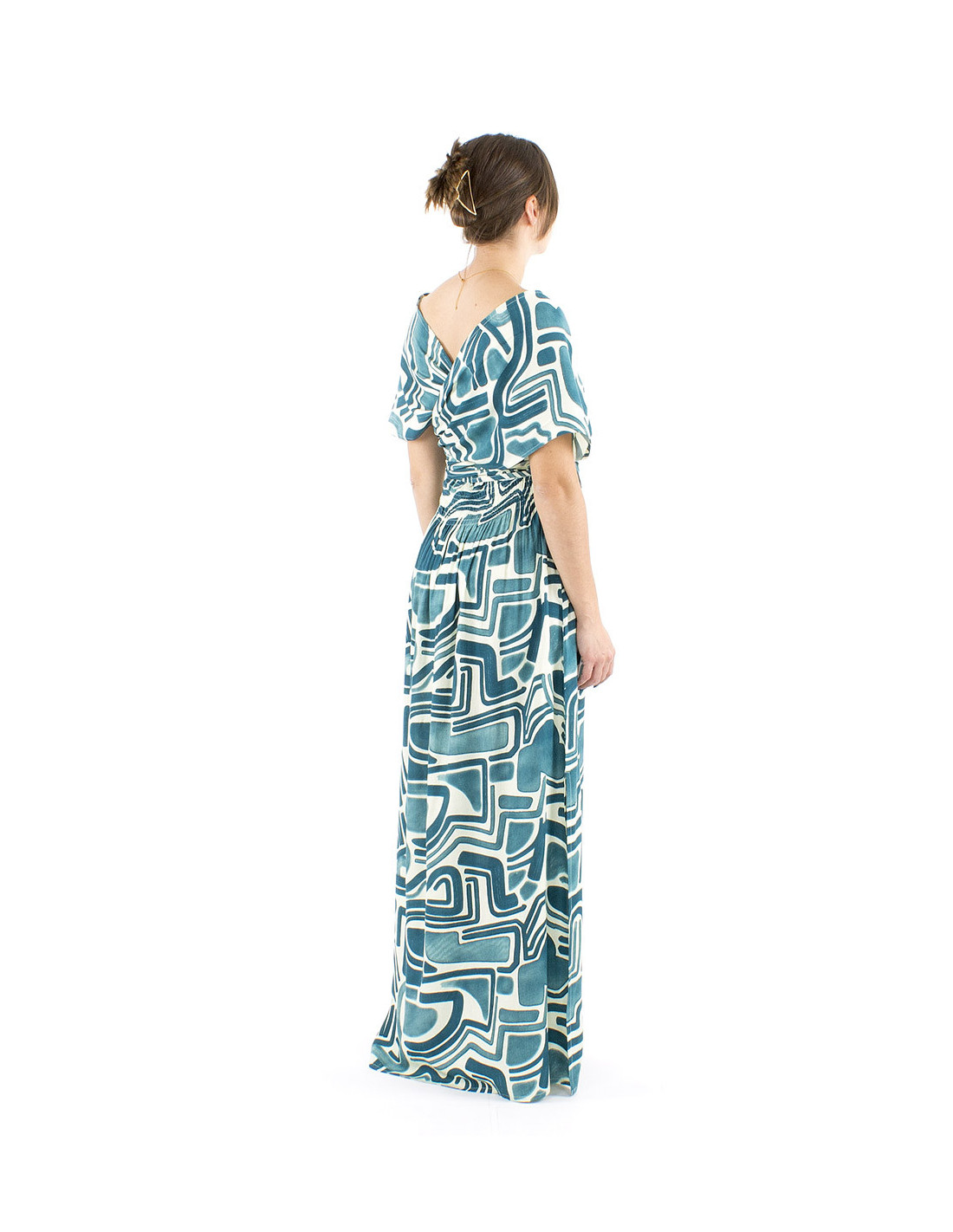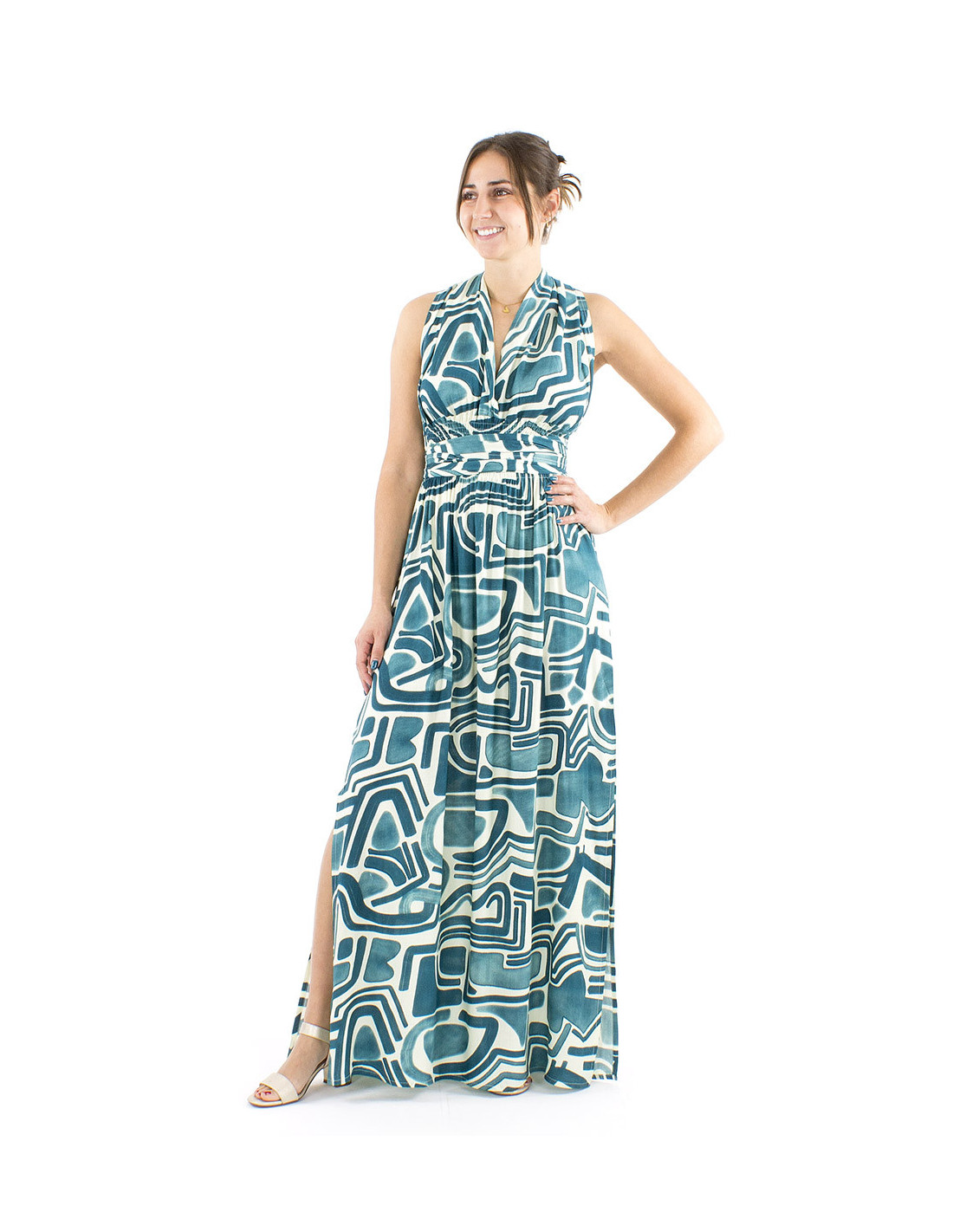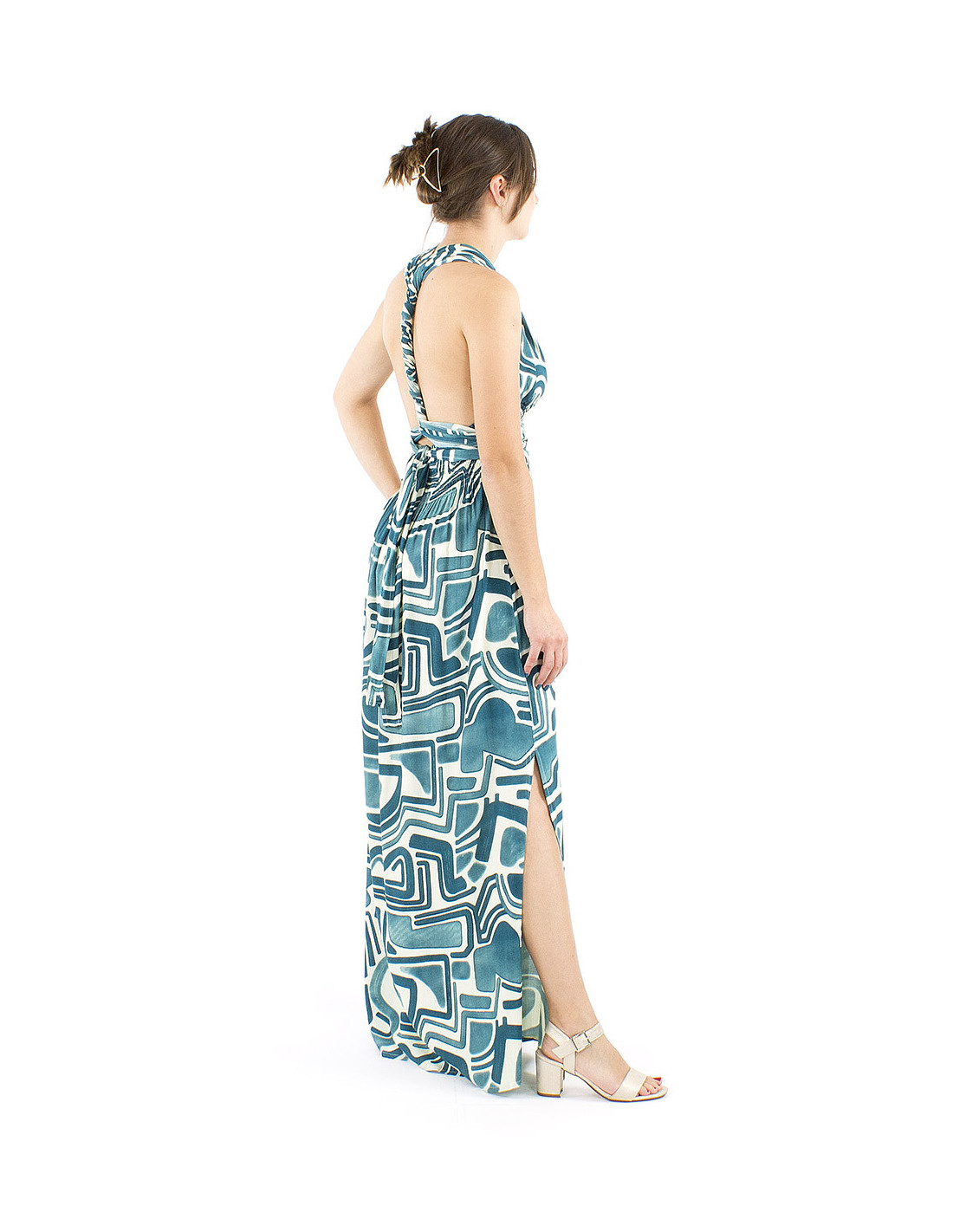 Robe longue modulable dos nu : adoptez le style afrohemian chic dans cette robe longue fluide et élégante, laissez-vous charmer par son motif inspiré du style ethnique africain, ses nuances de couleurs qui lui donnent un style abstrait et adoucissent ses lignes. Cette robe est modulable, vous pouvez la nouer de façon à la porter en dos-nu ou pour une tenue plus habillée la porter en manches chauve-souris en faisant retomber ses larges bandes de tissu sur vos épaules. Légèrement fendue sur le côté elle est élégante, raffinée et féminine Vous allez adorer sa texture, légère et fluide, qui souligne la silhouette. Un bijou deux en un qui ne vous quittera pas de l'été.