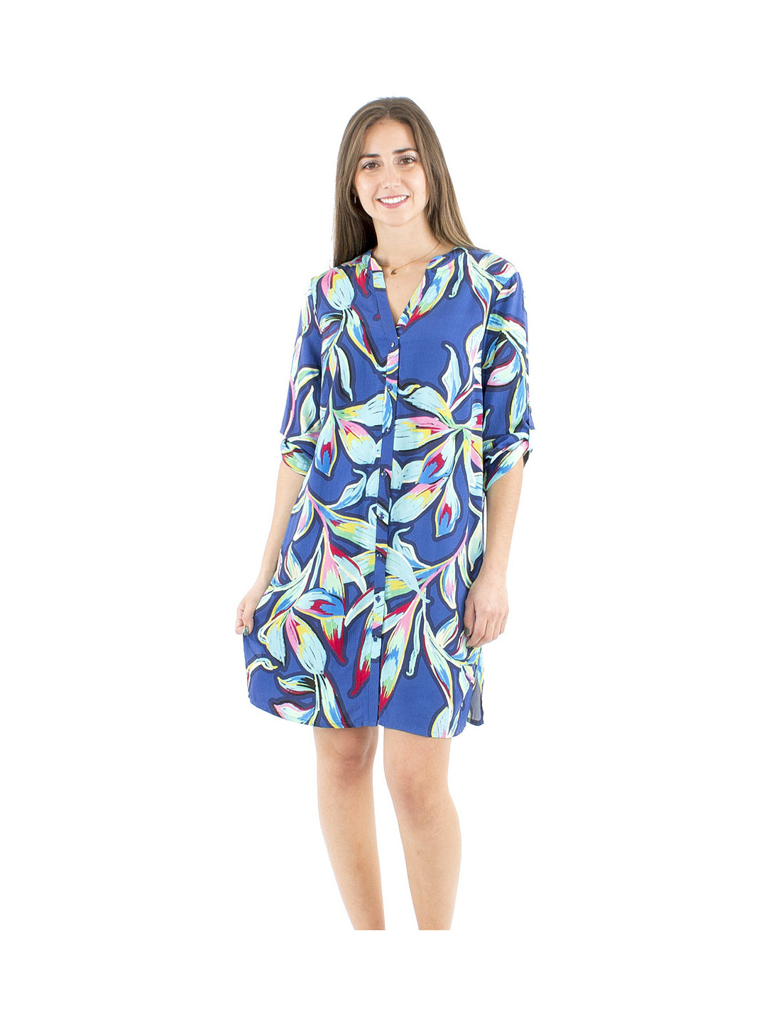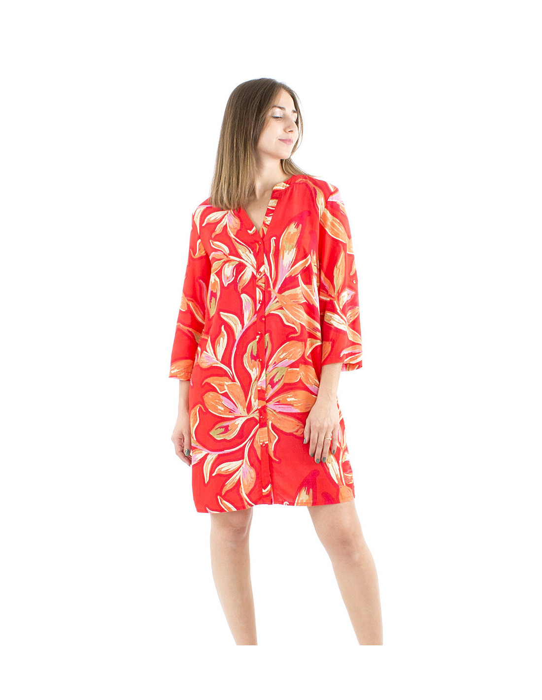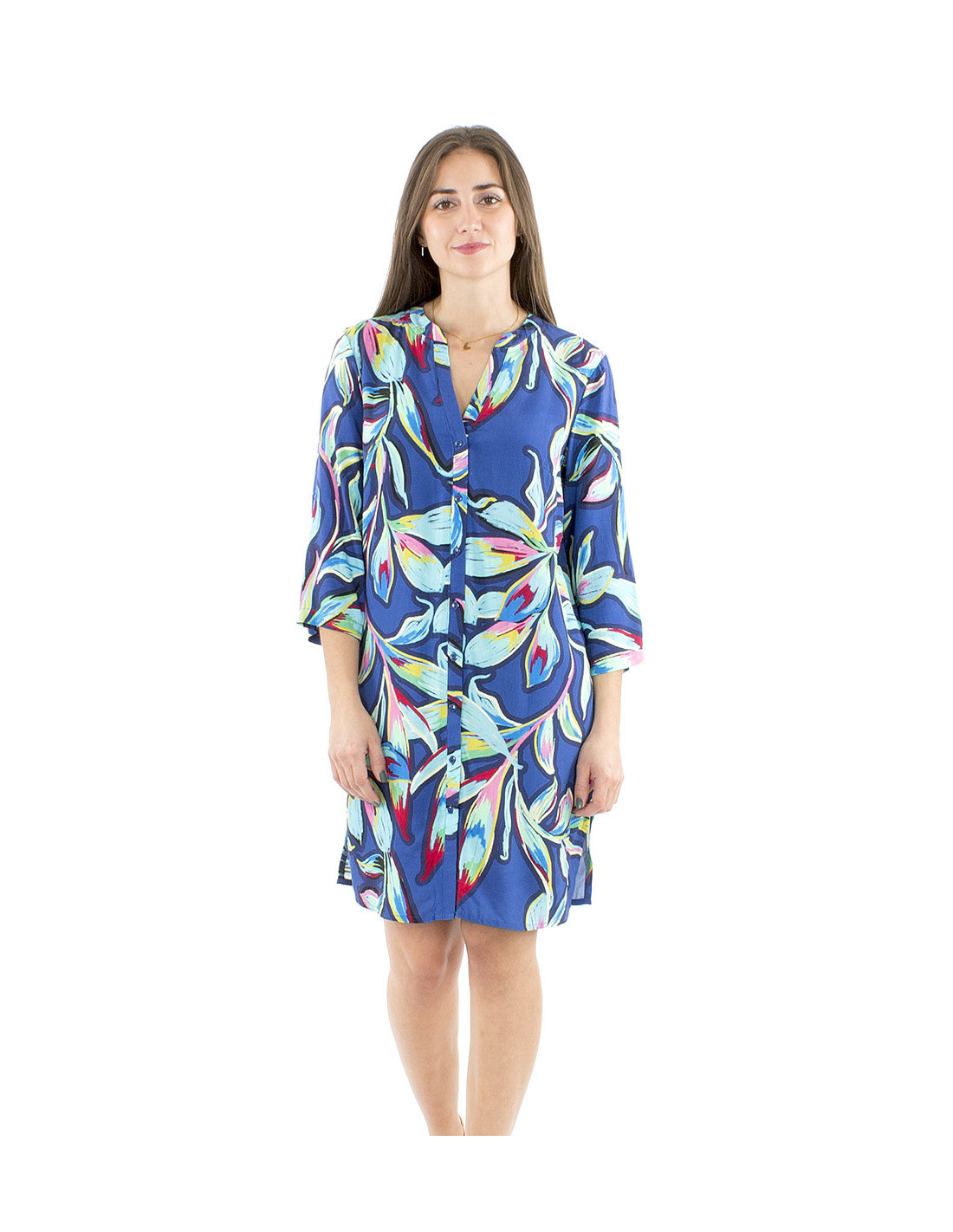Robe chemise colorée et légère : Vous aimez les pièces originales et colorées ? Vous avez trouvé la robe d'été multifonction idéale pour exprimer votre style avec créativité ! Légère grâce à sa confection 100% viscose et boutonnée de haut en bas, libre à vous de la porter comme robe tunique ou ouverte comme une longue veste d'été, son motif style art moderne végétal vous séduira par ses nuances dégradées de différentes couleurs, vous aimerez également son col V féminin et discret, une coupe classique qui vient contre-balancer son motif XXL plein de couleurs. Modulable grâce à ses manches longues ajustables, elle sera parfaite pour profiter de la belle saison même par fortes chaleurs. Cette robe tunique d'été est disponible en rouge ou en bleu, du S au 3XL.