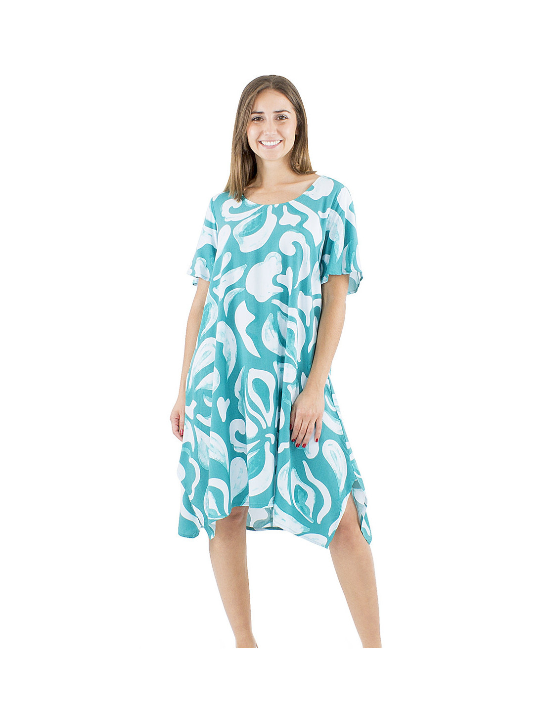 Robe d'été coupe coupe parapluie avec motif ethnique coloré : La coupe parapluie est la plus confortable à porter lors des longues journées d'été, elle vous laisse respirer tout en vous permettant d'être à l'aise dans toutes vos activités. Ce modèle de robe courte est adapté à toutes les morphologies, ample et fluide, c'est une robe dont vous ne vous lasserez pas, à la plage comme à la maison, vous serez féminine et à l'aise. Soyez charmée par son motif vif et plein de courbes qui appellent à la douceur et réhaussera la luminosité de votre teint, que ce soit en rouge ou en bleu émeraude, ce motif original ne passera pas inaperçu. Un col rond féminin tout en étant discret, des manches courtes larges pour faire face à la chaleur estivale, ce modèle est disponible du S au XL.