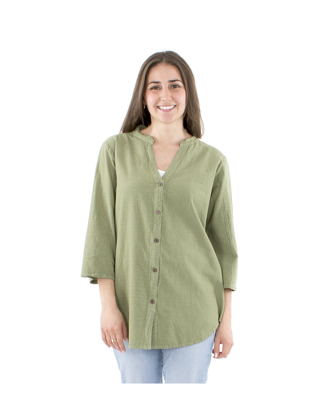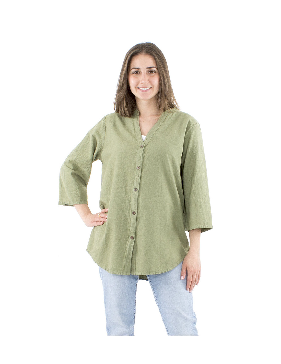 Cette chemise d'été large et confortable est la pièce bohème chic à avoir absolument dans votre dressing. Sa confection 100% coton lui donne un rendu naturel très élégant et s'accorde parfaitement avec ses boutons en bois de coco. Portée ouverte ou fermée elle vous offre deux styles différents, l'un plus décontracté, lorsqu'elle est ouverte, comme une chemise de peintre oversize, et l'autre plus habillée, portée fermée, laissant apparaître un joli décolleté en V et des finitions de col style mao arrondies et agréables à l'oeil. Disponible couleur vert sauge, bleu, corail ou blanc, elle existe du S au XXL.