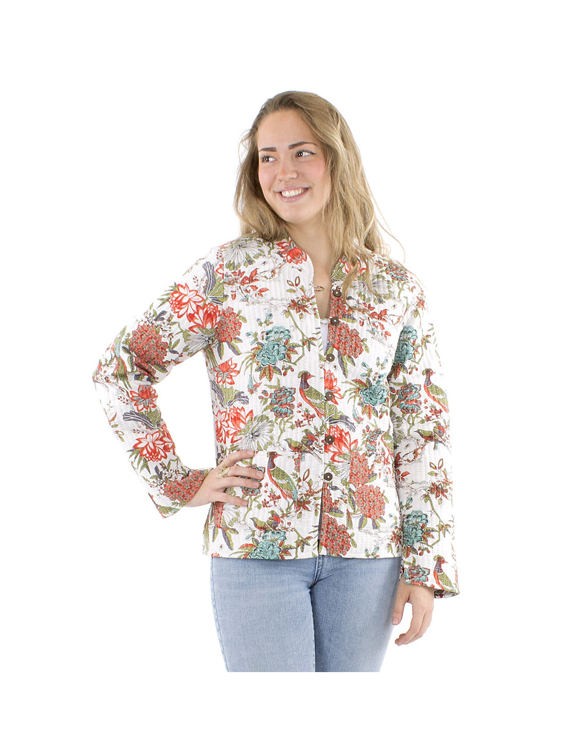 Vous allez adorer l'audace et l'originalité de cette veste matelassée réversible 100% coton : un motif au style tropical, mélangeant différentes fleurs aux couleur douces et chaleureuses d'un côté, et un autre motif complètement romantique et bohème avec ses fleurs roses et ses entrelacements de feuilles et de tiges tel un rosier sauvage en début de printemps. Conçue avec deux poches à l'avant, intérieures ou extérieures en fonction du sens dans lequel on la porte, cette veste de mi-saison est pratique, confortable et en même temps très chic avec ses boutons exotiques en bois de coco et son col façon mao qui souligne votre port de tête. Disponible du S au XXL, pour satisfaire toutes les femmes, qu'elles aient une physionomie fine ou plus généreuse. Longueurs : S : 62cm, M : 64cm, L : 66cm, XL : 68cm, XXL : 70cm