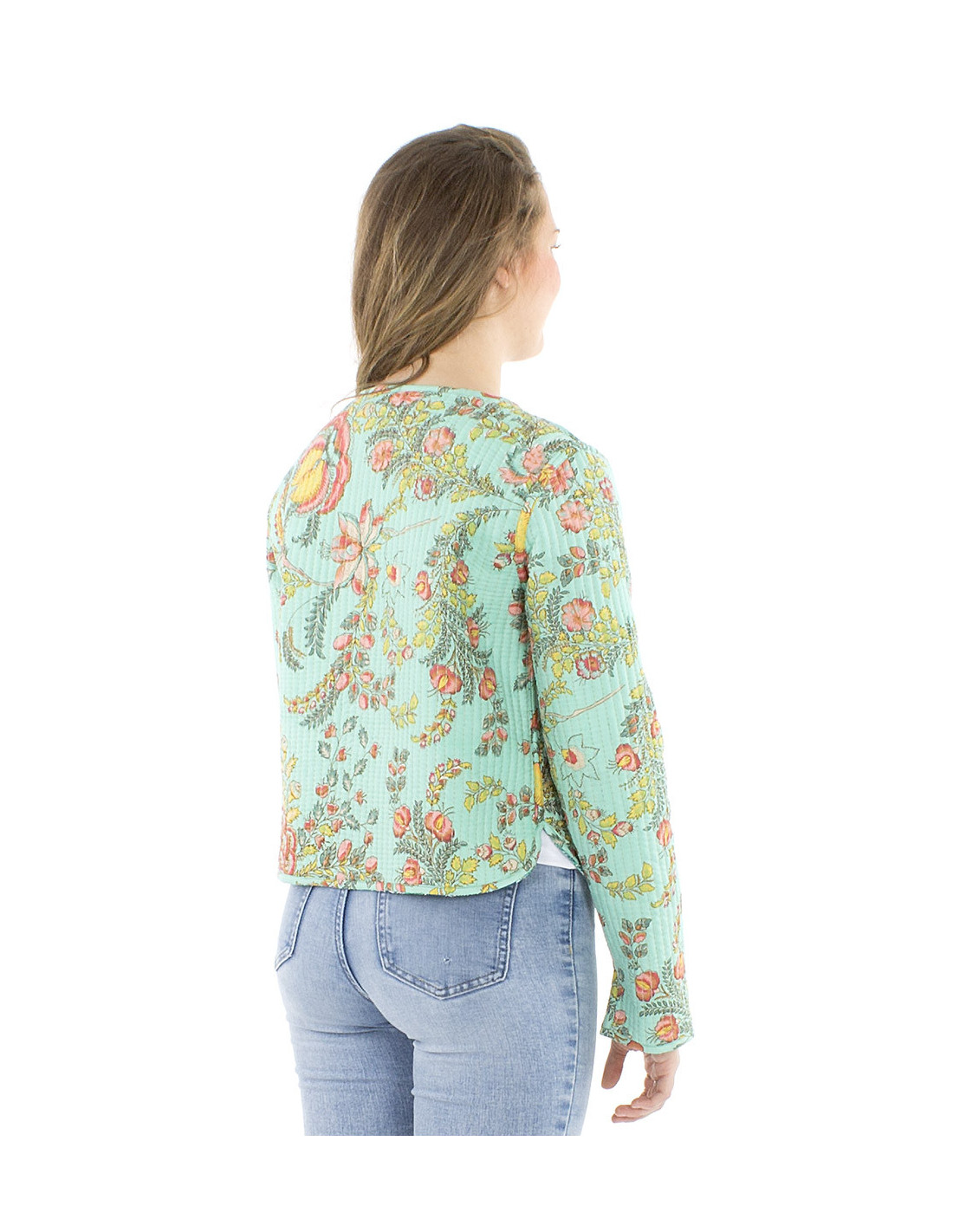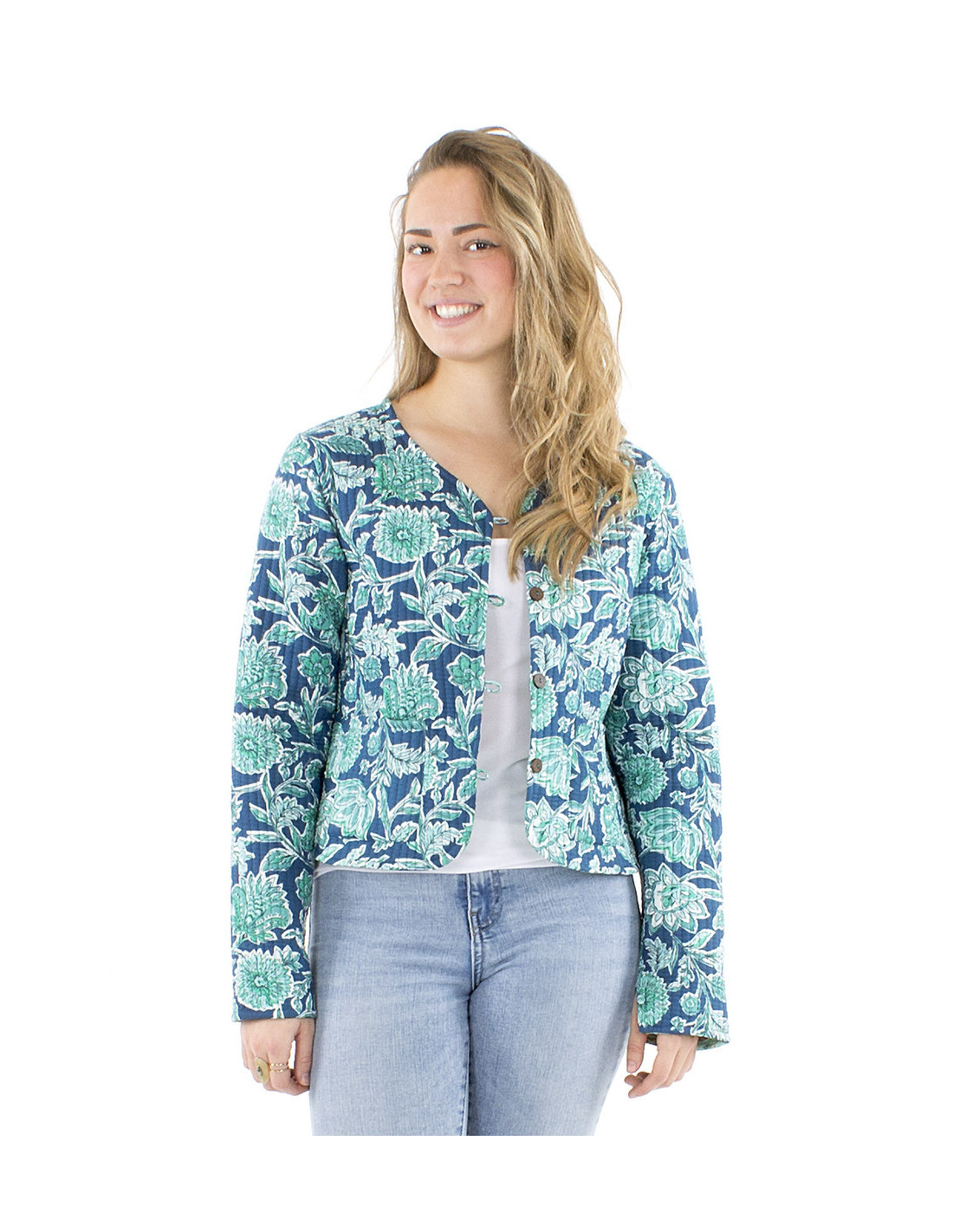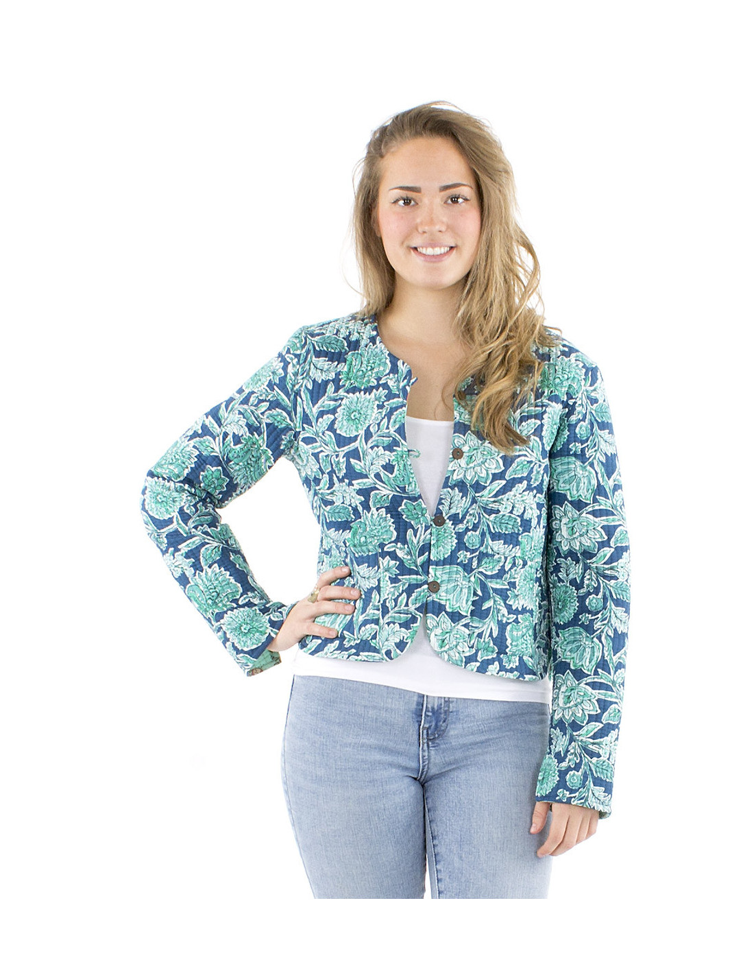 Fondez pour cette veste courte matelassée au style bohème, originale avec sa fonction réversible et ses motifs très colorés, vous apprécierez ses deux styles d'inspiration ethnique, tantôt bohème tantôt tropical. Sa coupe épurée et son col style mao, ajoutés à ses boutons en bois de coco en font une vraie pièce de mode qui ne passera pas inaperçue. Une veste 100% coton, une pièce deux en un, c'est une multitude de combinaisons possibles avec votre garde-robe. Modèle disponible du S au XL.