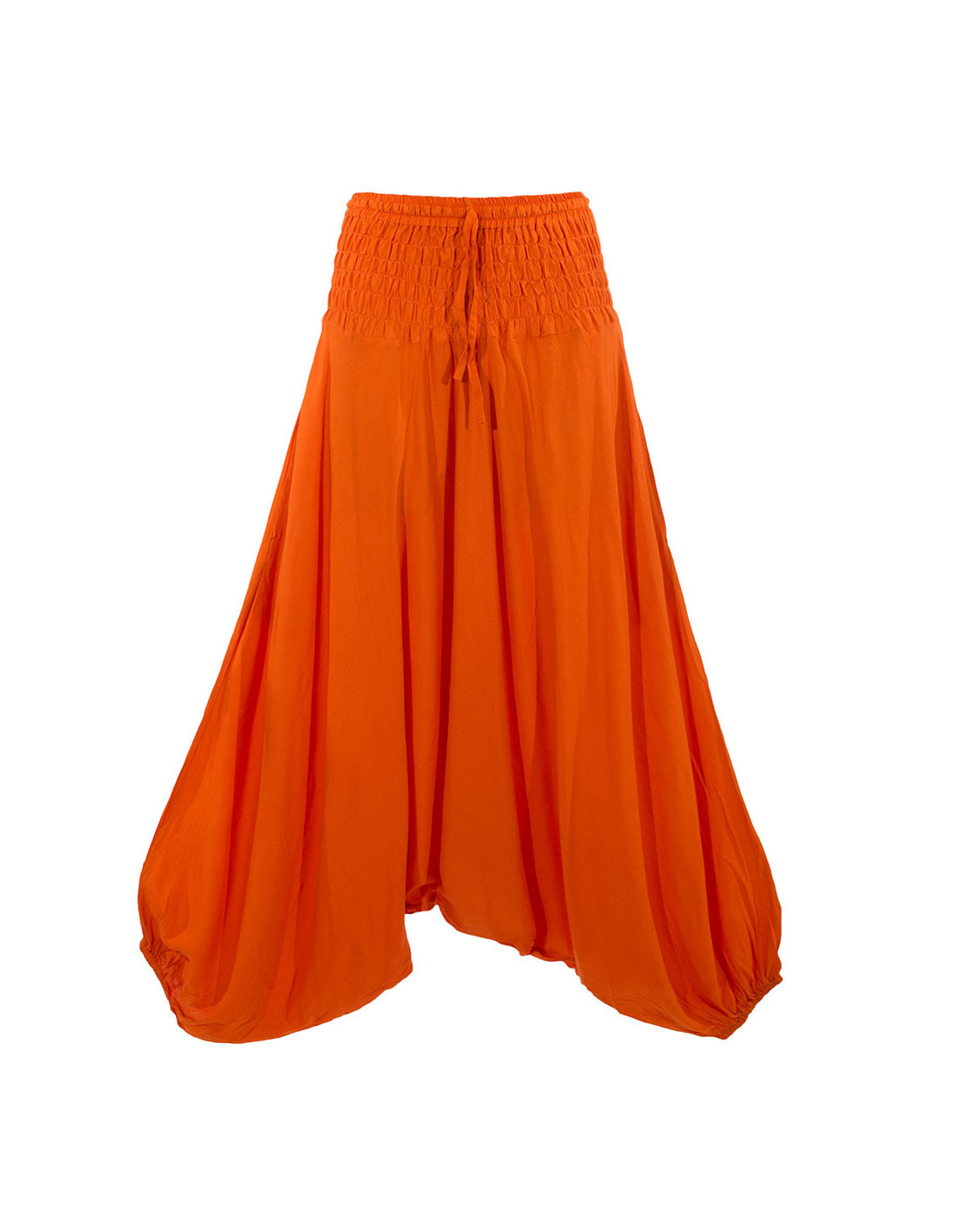 Sarouel viscose fourche basse. Large ceinture smockée avec lien de serrage, chevilles élastiquées, poches sur les cotés. Sa matière fluide et légère vous enchantera.