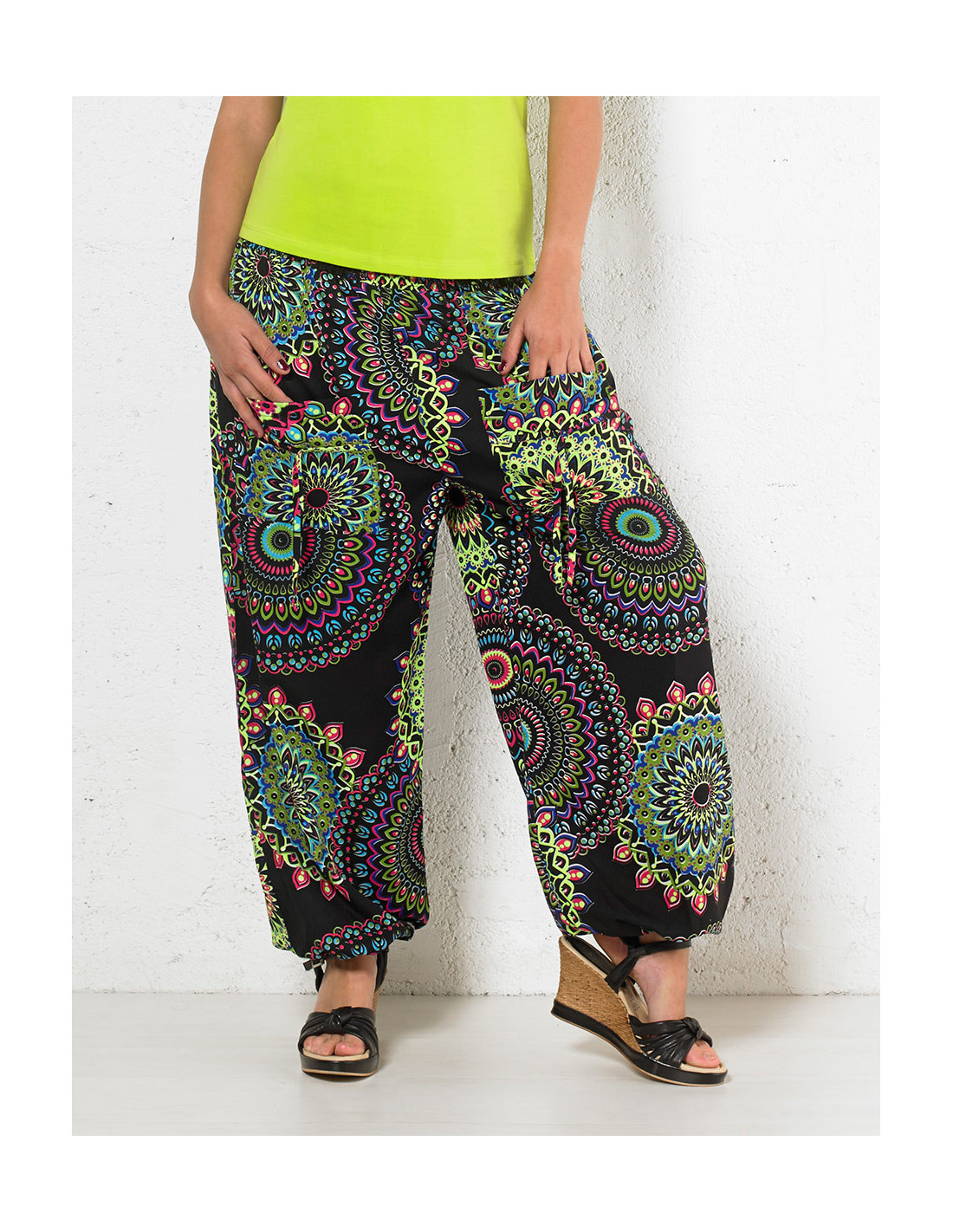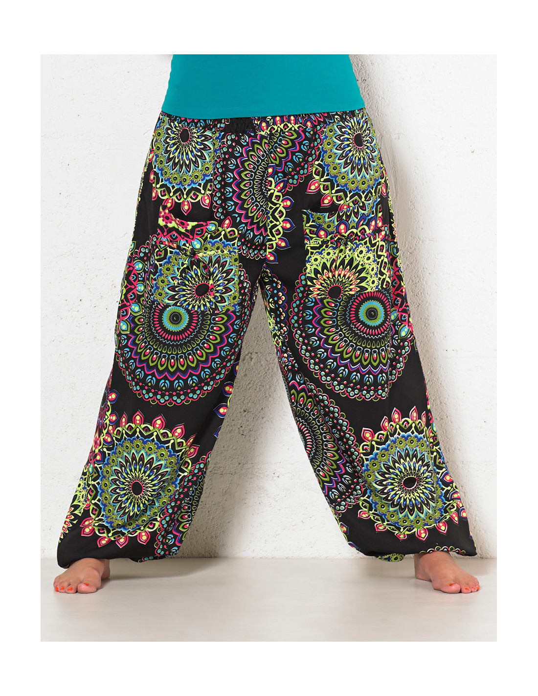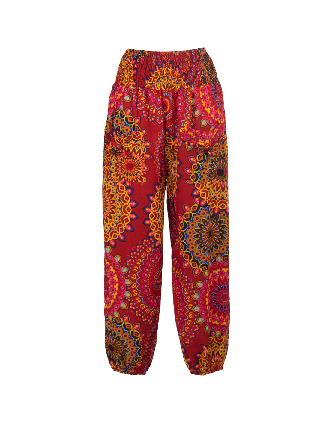 Pantalon droit avec deux poches sur le devant. L'imprimé mandala apporte la touche de fraicheur et le smock aux chevilles lui donne un aspect bouffant.
