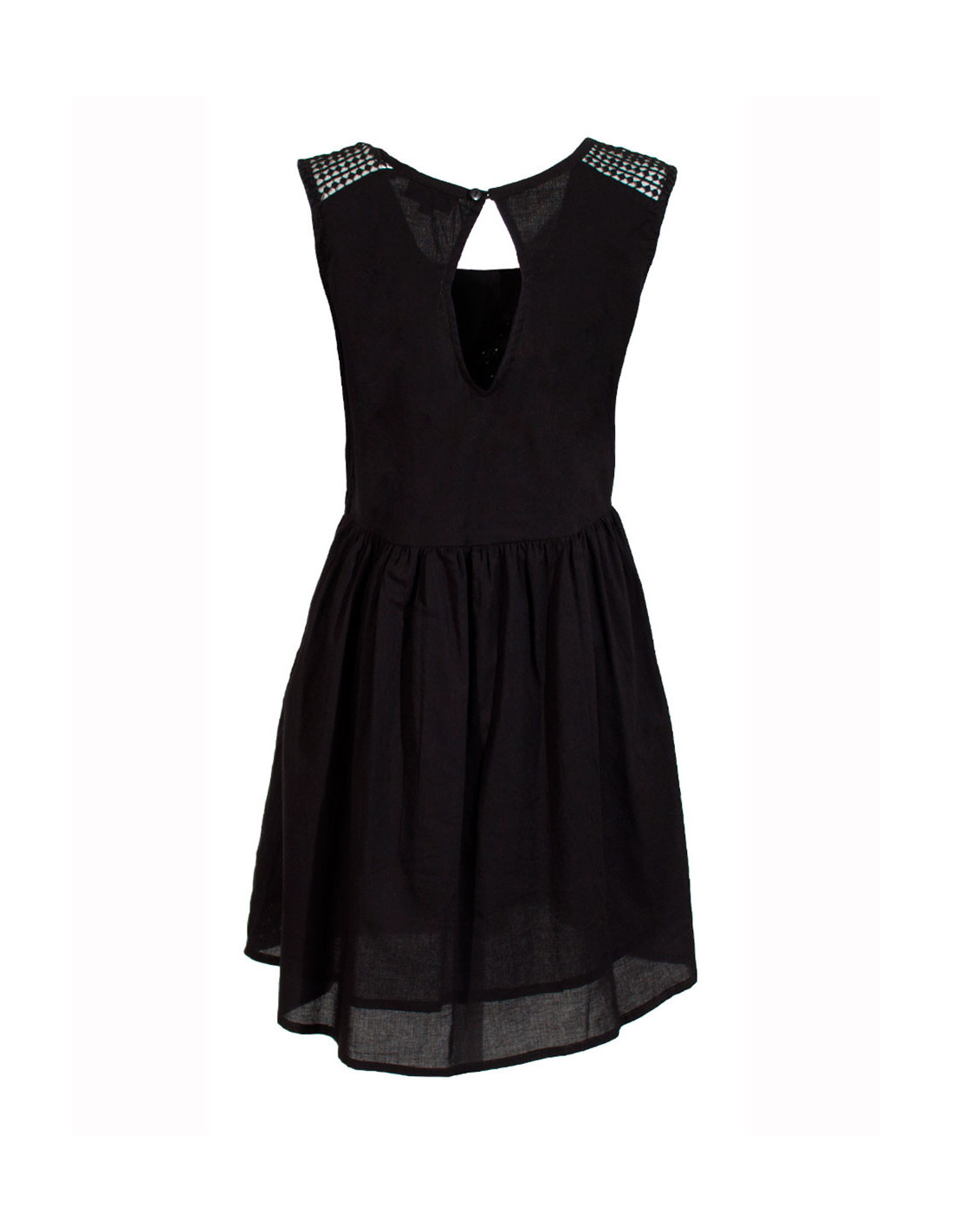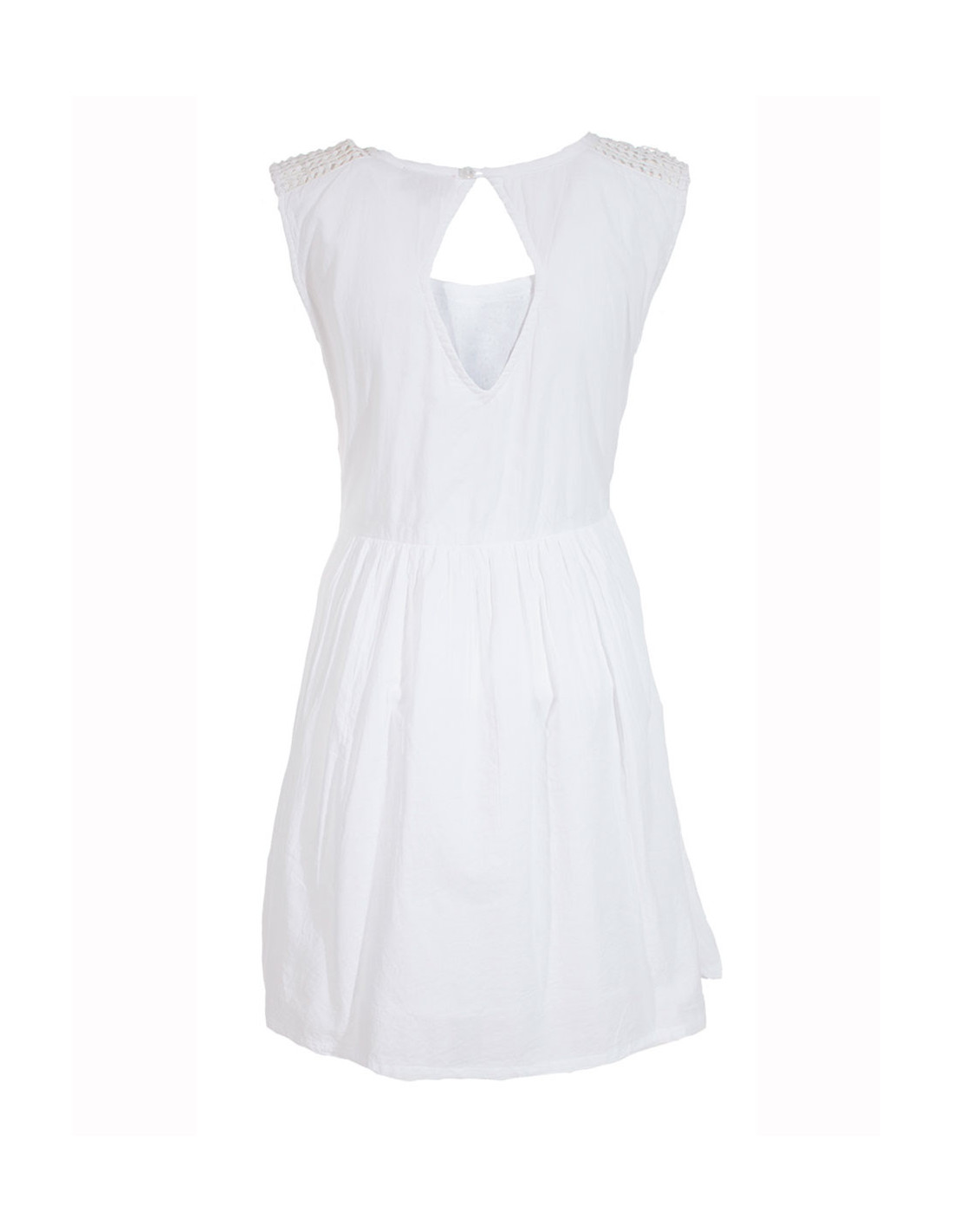 'Robe courte 100% coton, doublée, broderies ton sur ton sur le devant, unie dans le dos, dentelle au niveau des épaules.'