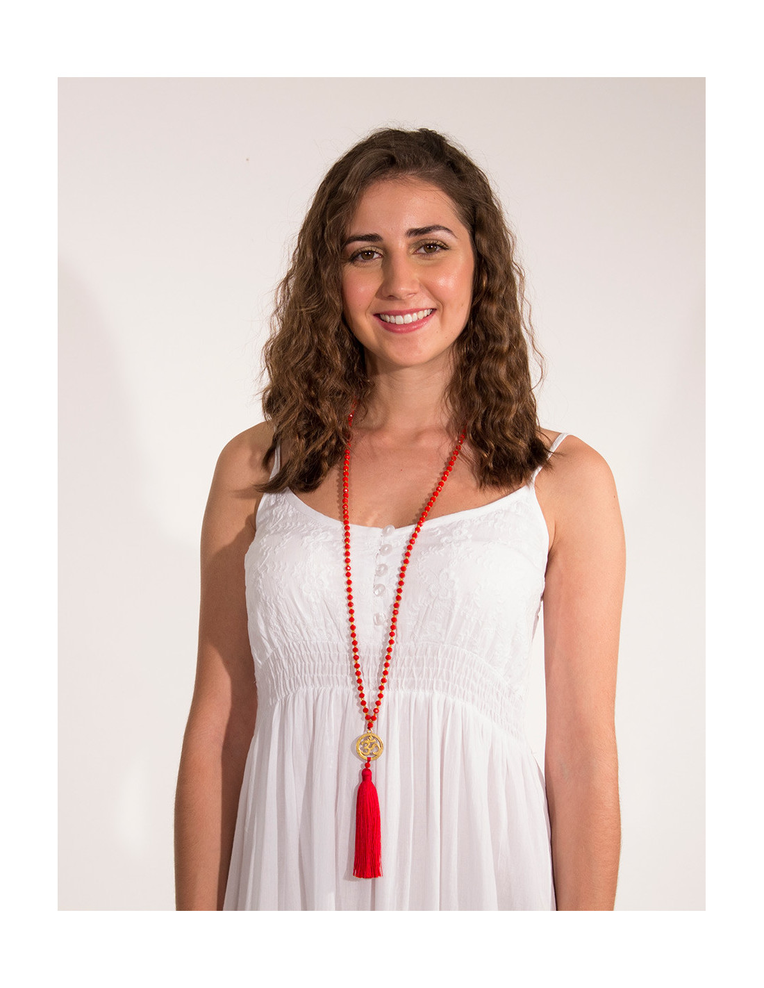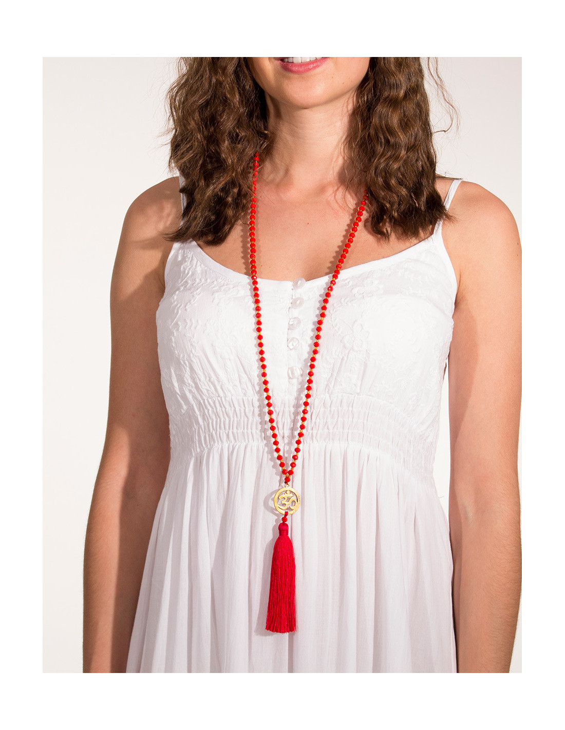 'Ce joli collier fin et épuré possède de belles couleurs. Vous aurez trois modèles, un bleu ciel, un rouge et un blanc. On adore ses jolies petites perles et son pendentif au motif asiatique. Son joli pompon agrémente le look d'un style bohème. Accessoirisez vos tenues boho cet été avec ce superbe collier de perles'