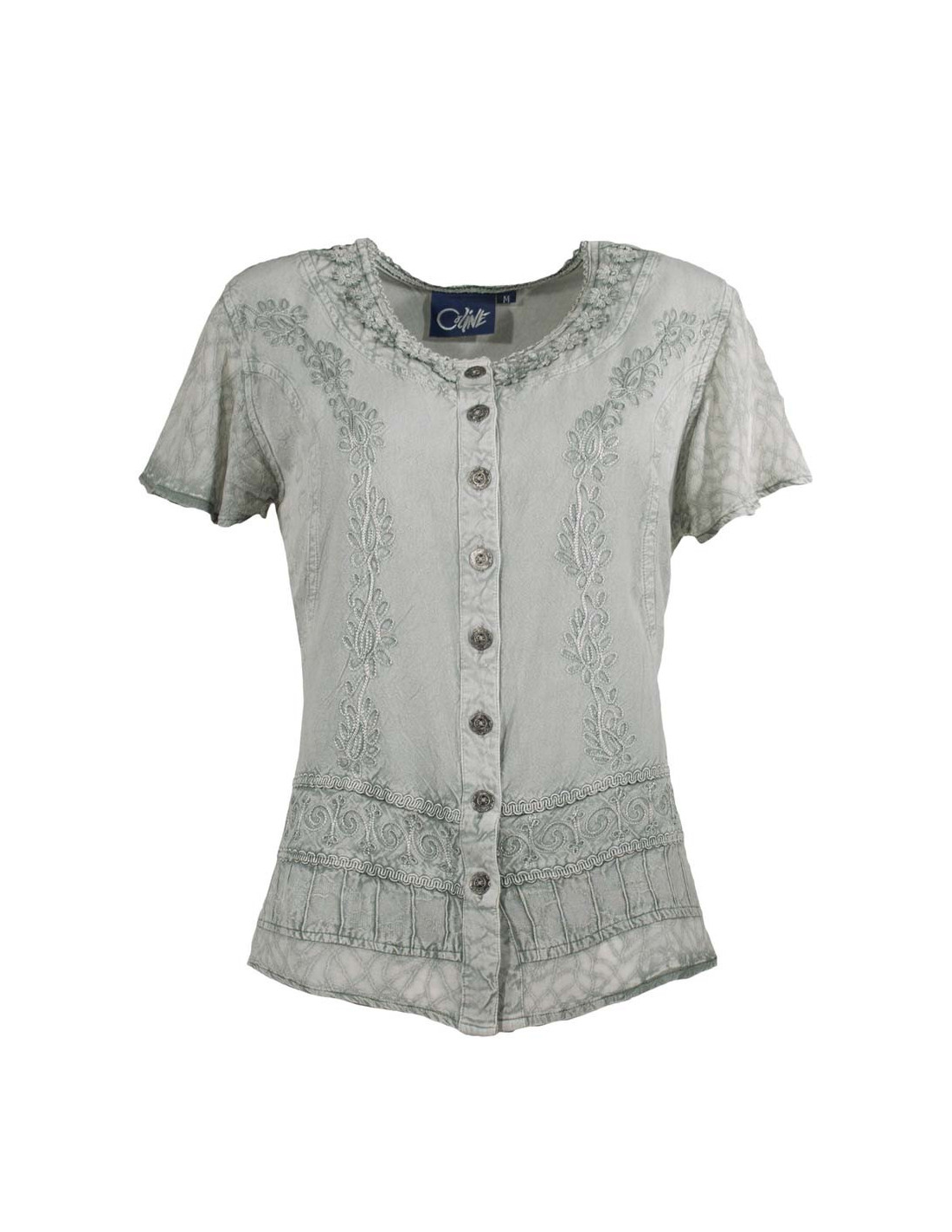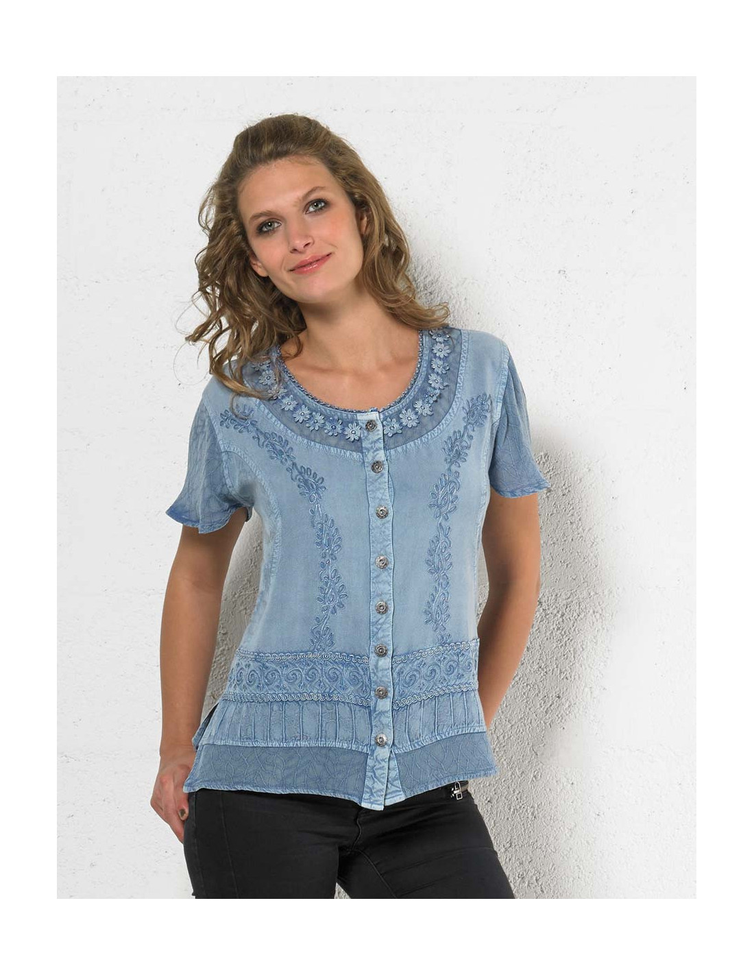 'Chemisier manches courtes, col rond, fermeture boutons, lien de serrage dans le dos. Elégantes broderies ton sur ton.'