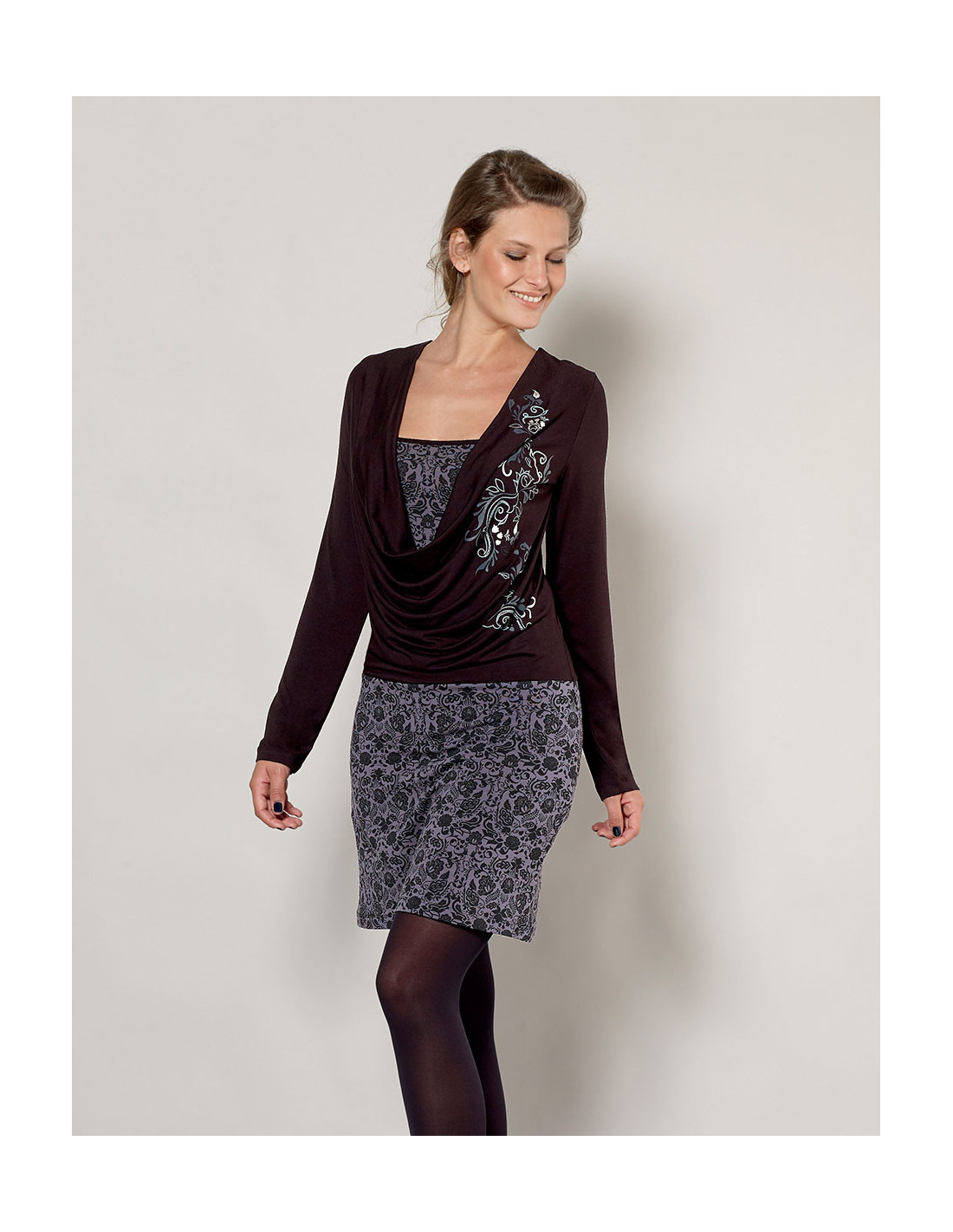 Cette robe à manches longues saura vous avantager avec son immense col bénitier en jersey viscose doublé de jersey coton à l'imprimé baroque. Vos mouvements dévoileront de jolis imprimés gris et argentés disposés le long du col. Longueur S : 88cm - XXXL : 98cm